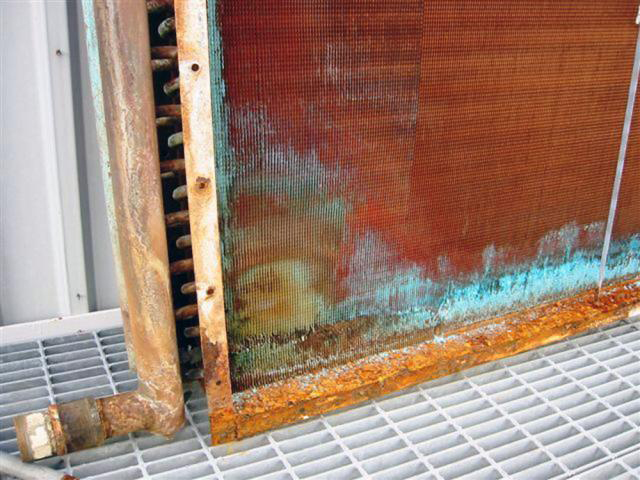 La batteria è fondamentalmente uno scambiatore di calore ed il calore è trasferito attraverso la superficie dei tubi alle alette. L’aletta è in contatto stretto con il tubo che, infatti, è espanso all’interno del collare delle alette.Il primo effetto dell’inquinamento sull’aletta è il deposito di sporcizia su di essa, isolando parzialmente la superficie di scambio secondario dal contatto con l’aria. Successivamente, quando le particelle di sporcizia sono state in contatto per un tempo sufficiente ed il processo di corrosione è iniziato (corrosione da impatto atmosferico), la superficie alettata comincia a degradarsi, diminuendo così la capacità di scambio termico. Non bisogna dimenticare che lo spessore di un’aletta è dell’ordine di grandezza di 0.17 mm e la corrosione non impiega molto tempo a degradare uno spessore di metallo così sottile.
